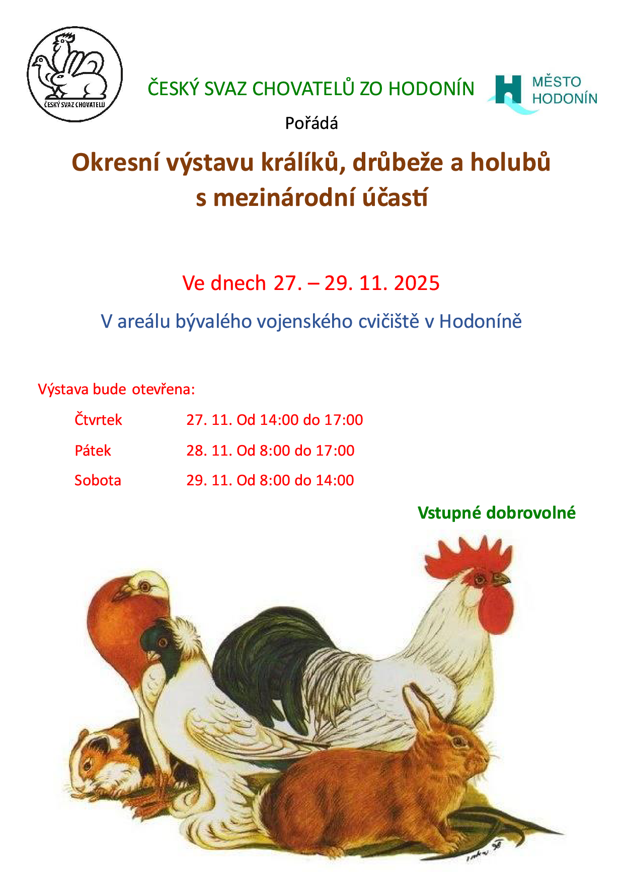 ZVEME VÁS NA 8. OBLASTNÍ A 19. OKRESNÍ VÝSTAVU ZVÍŘAT MLADÝCH CHOVATELŮ, S UKÁZKOU KRÁLIČÍHO HOPU. DÁLE NA MÍSTNÍ VÝSTAVU KRÁLÍKŮ, HOLUBŮ, DRŮBEŽE, EXOTŮ a OSTATNÍCH ZVÍŘAT ...